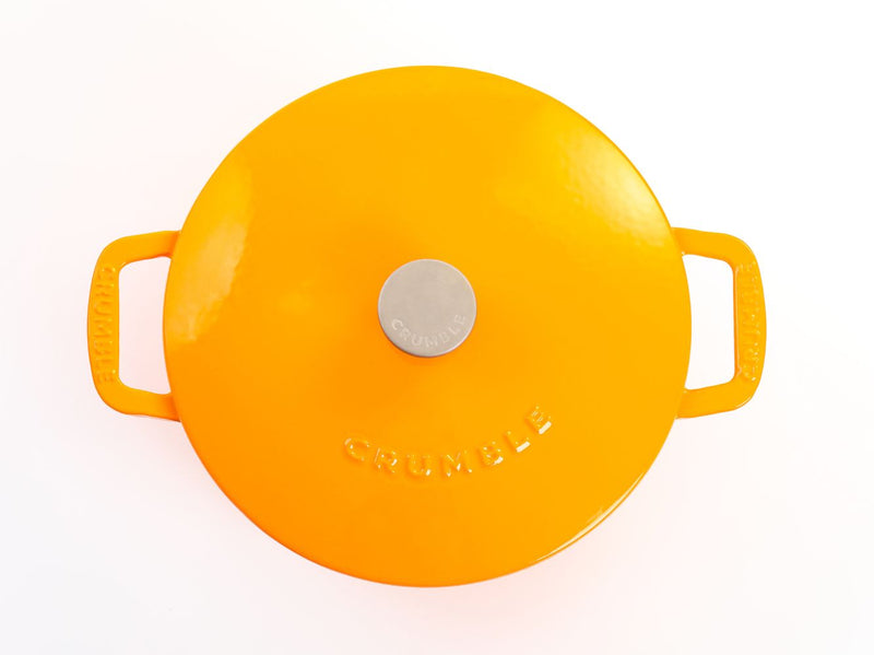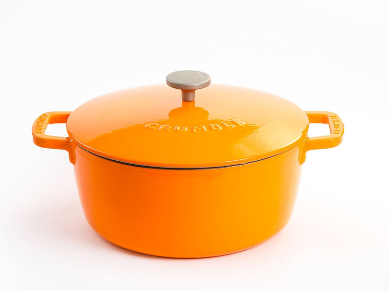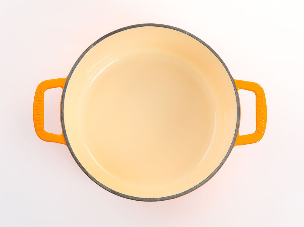 Although enamelled cast iron is dishwasher safe, hand washing with warm soapy water and a nylon scrub brush is recommended to preserve the cookware's original appearance.
