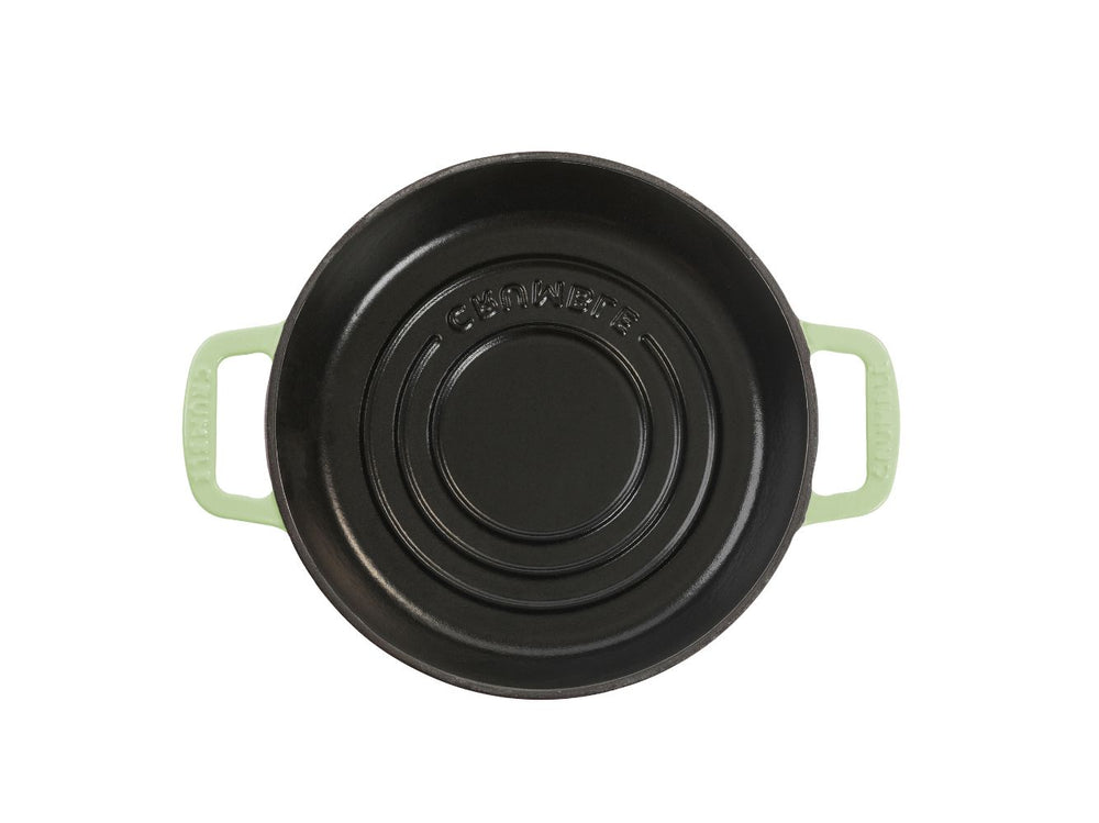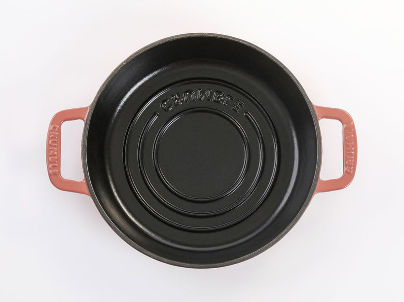 Although enamelled cast iron is dishwasher safe, hand washing with warm soapy water and a nylon scrub brush is recommended to preserve the cookware's original appearance.