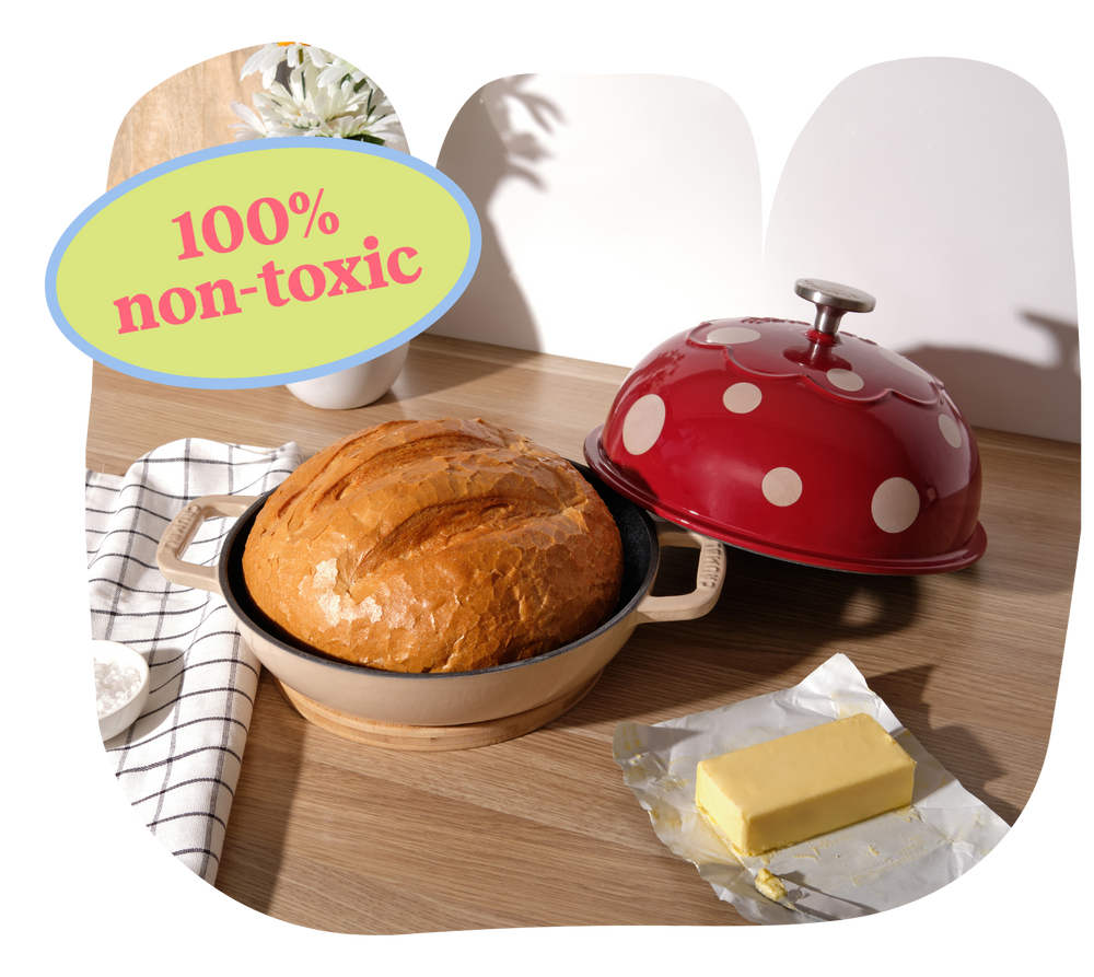 We offer both pre-seasoned and enamel coated cast-iron cookware of which are both fantastic non-toxic cookware options that are free from harmful chemicals like lead, PTFE and PFOA.