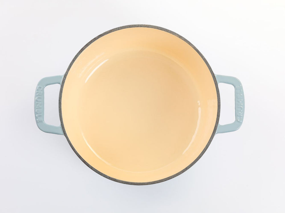 Although enamelled cast iron is dishwasher safe, hand washing with warm soapy water and a nylon scrub brush is recommended to preserve the cookware's original appearance.