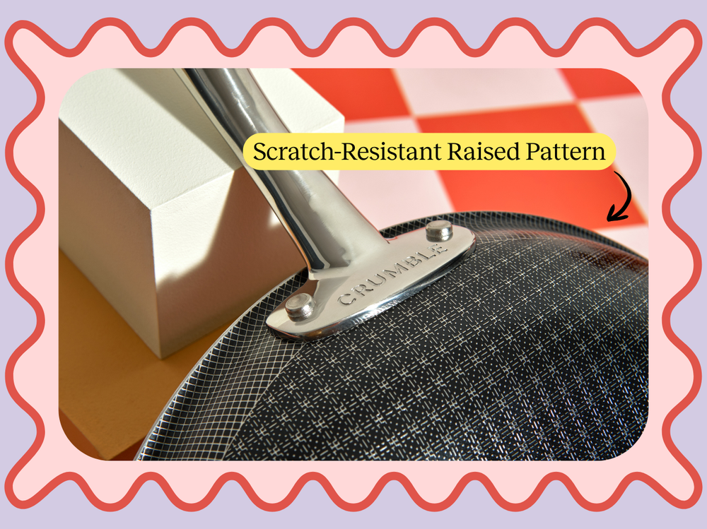 CrumbleCoat™ features our signature laser-etched gingham pattern which is slightly raised on top of the cookware surface to offer added durability, effortless food release and superior heat distribution.