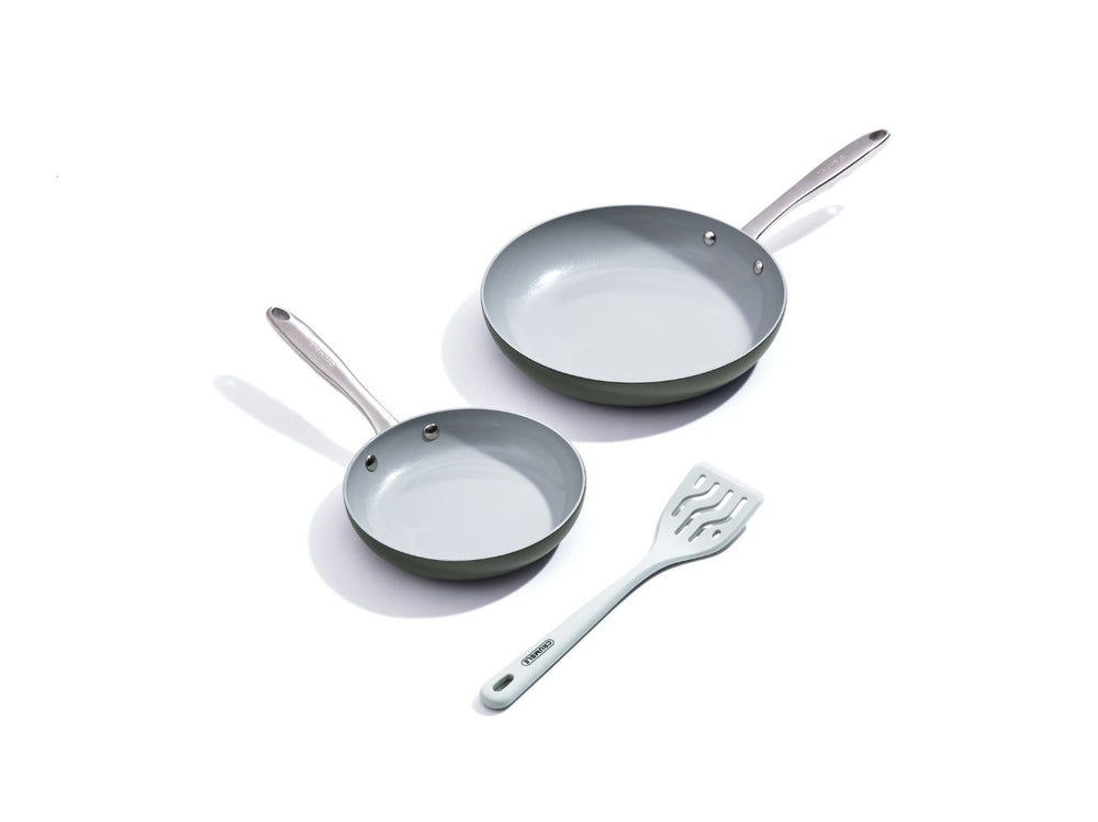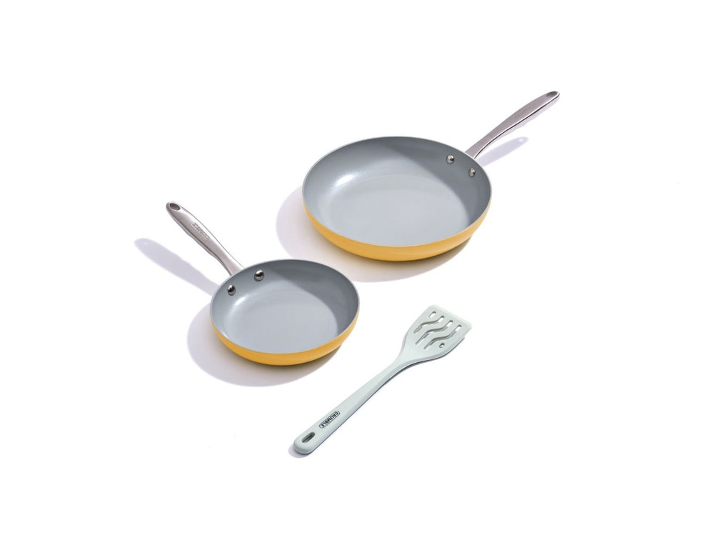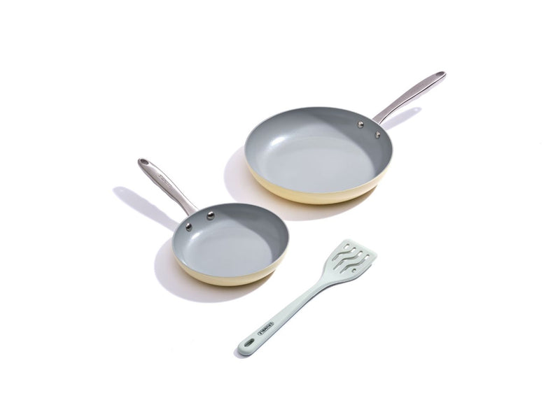 The Duo Fry Ceramic Non-Stick Set includes the Large 28cm Fry Pan and Baby 20cm Fry Pan. A harmonious pair for searing up your protein in one and crafting the perfect side or sauce to complete your meals.Â